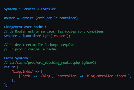 - Conteneur Compilé: En production, Symfony analyse tout le graphe de dépendances et génère une énorme classe PHP optimisée qui contient toutes les instanciations "en dur". C'est ultra-rapide.