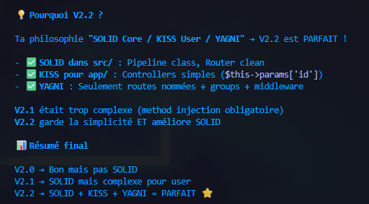 Je choisi l'approche SOLID pour le coeur du Framework, une approche KISS (Keep it simple, stupe) pour la partie Utilisateur et YAGNI (you ain't gonna neet it) pour les features en cours.